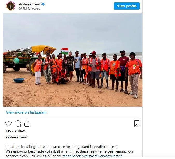 अक्षय कुमार ने भी “असली नायकों” के साथ एक तस्वीर शेयर की और मुंबई के समुद्र तटों की सफ़ाई करने वालों की सराहना की। उन्होंने लिखा, “जब हम अपने पैरों के नीचे की ज़मीन की देखभाल करते हैं, तो आज़ादी ज़्यादा उज्ज्वल लगती है। मैं बीच साइड वॉलीबॉल को एंजॉय कररहा था, जब मेरी मुलाक़ात इन रियल लाइफ के नायकों से हुई जो हमारे समुद्र तटों को साफ़ रख रहे हैं… सभी मुस्कुरा रहे थे, पूरे दिल से।”