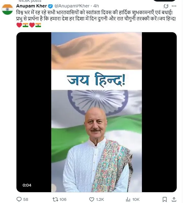 अनुपम खेर ने भी अपने इंस्टाग्राम हैंडल के जरिए स्वतंत्रता दिवस की शुभकामनाएं शेयर कीं और देश में विकास की कामना की। अनुपम खेर ने लिखा, “विश्व भर में रह रहे सभी भारतवासियों को स्वतंत्रता दिवस की हार्दिक शुभकामनाएँ एवं बधाई! प्रभु से प्रार्थना है कि हमारा देश हर दिशा में दिन दुगनी और रात चौगुनी तरक्की करें। जय हिन्द!