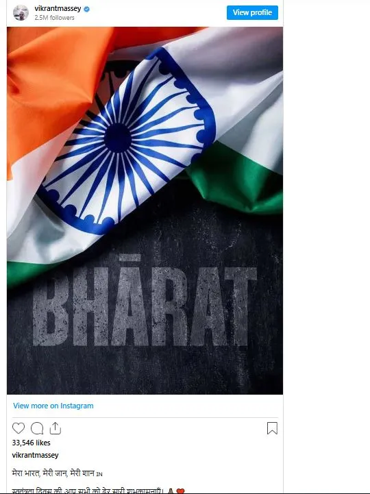विक्रांत मैसी ने हाल ही में फिल्म 12वीं फेल में अपने अभिनय के लिए बेस्ट अभिनेता का राष्ट्रीय पुरस्कार जीता है। उन्होंने भी अपने इंस्टाग्राम हैंडल पर भारतीय राष्ट्रीय ध्वज की एक तस्वीर शेयर की और हिंदी में लिखा, “मेरा भारत, मेरी जान, मेरी शान। स्वतंत्रता दिवस की आप सभी को शुभकामनाए।”