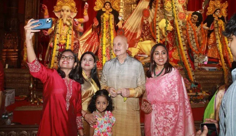 अनुपम खेर पीले कुर्ते-पजामे में दुर्गा पूजा में शामिल हुए। उन्होंने देवी के दर्शन के बाद फैंस और पैपराजी के साथ तस्वीरें क्लिक कराईं।