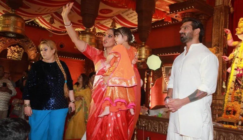 बिपाशा बसु लाल साड़ी में, बेटी देवी ऑरेंज ड्रेस में और करण सिंह ग्रोवर व्हाइट आउटफिट में दुर्गा पूजा में पहुंचे।
