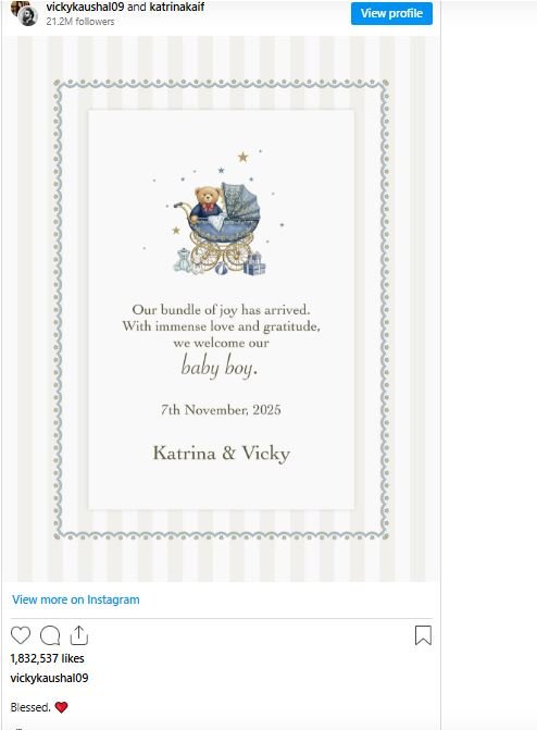 विक्की कौशल ने सोशल मीडिया पर लिखा- ब्लेस्ड। हमारी खुशियों का बंडल आ गया है। ढेर सारे प्यार और आशीर्वाद से हमने बेबी बॉय का वेलकम किया है। 7 नवंबर 2025। कैटरीना और विक्की।”