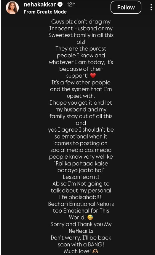 लगातार सवालों और अफवाहों से परेशान होकर नेहा ने साफ शब्दों में कहा कि उनका ब्रेक मेंटल हेल्थ और काम से जुड़ा था, न कि शादी से। उन्होंने लिखा कि लोग बिना सोचे-समझे उनके “मासूम पति” को भी निशाना बना रहे हैं, जो बेहद गलत है।