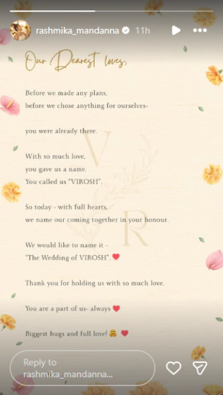 विजय और रश्मिका ने हाल ही में एक संयुक्त बयान जारी करके अपनी शादी की पुष्टि कर दी है। दोनों ने बताया कि उनकी शादी को आधिकारिक रूप से ‘द वेडिंग ऑफ VIROSH’ कहा जाएगा। खास बात यह है कि यह नाम किसी वेडिंग प्लानर या पारिवारिक परंपरा से नहीं, बल्कि उनके फैंस द्वारा सालों पहले प्यार से दिए गए नाम से जुड़ा है।