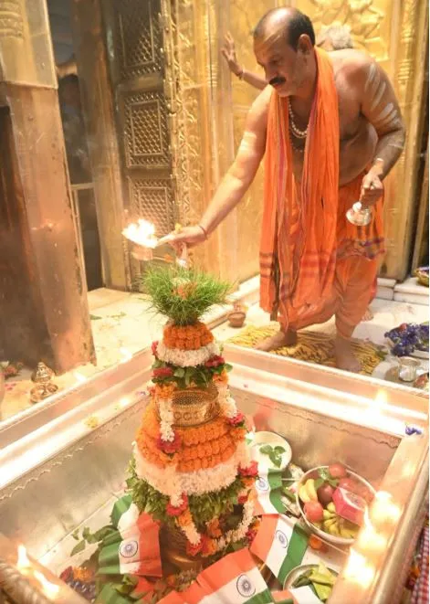 बाबा विश्वनाथ के दरबार को तिरंगे के तीनों रंगों के फूलों से सजाया गया था। केसरिया गेंदा, सफेद रजनीगंधा और हरे रंग की पत्तियों से गर्भगृह का हर कोना दुल्हन की तरह सजा हुआ था। इसके अलावा, गर्भगृह में जगह-जगह राष्ट्र ध्वज भी लगाए गए थे, जो इस ऐतिहासिक क्षण को और भी खास बना रहे थे।