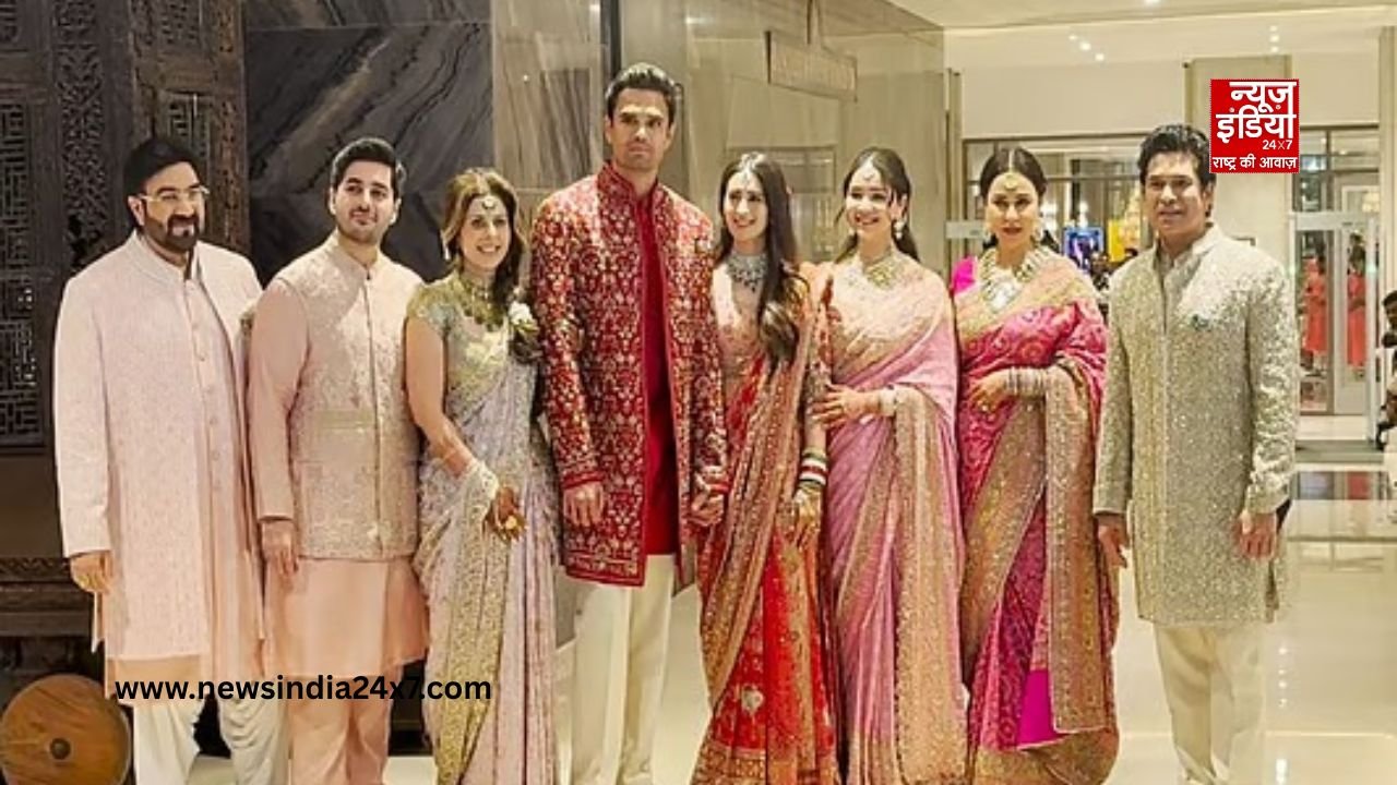 Arjun Tendulkar Wedding: भारतीय क्रिकेटर अर्जुन तेंदुलकर इन दिनों अपनी शादी को लेकर सुर्खियों में बने हुए हैं। इस खास मौके से जुड़ी तस्वीरें और लुक सोशल मीडिया पर तेजी से वायरल हो रहे हैं। शादी के माहौल में परिवार के सदस्यों का पारंपरिक अंदाज लोगों का ध्यान खींच रहा है। खासकर दुल्हन सानिया तेंदुलकर और अर्जुन की बहन सारा तेंदुलकर के एथनिक लुक की काफी चर्चा हो रही है।