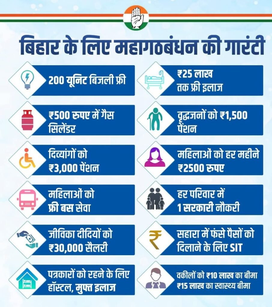 बिहार चुनाव को लेकर कल दूसरे आखिरी चरण मी वोटिंग से पहले महाठबंधन ने अपनी गारंटी को जनता को याद दिलाया है। दरअसल वोटिंग से ठीक एक दिन पहले कांग्रेस समित सहयोगी दलों ने अपनी 12 गारंटी का पोस्टर जनता के सामने याद दिलाने के लिए रखा गया।